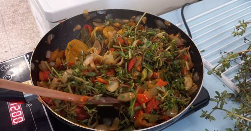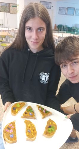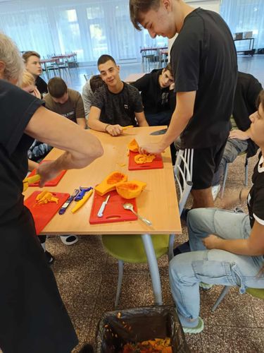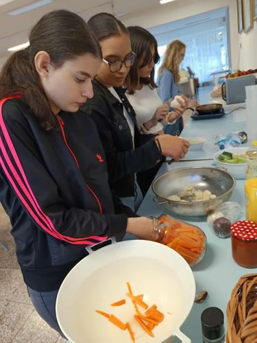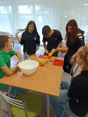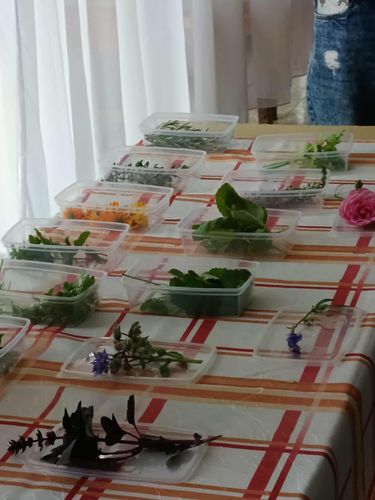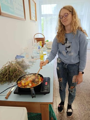 A délutánt a kollégiumban folytattuk, ahol az iskola kertészetében termelt zöldségekből és vadontermő növényekből közösen készítettünk: